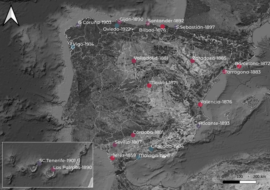 Principales ciudades españolas en implantar servicio de tranvía desde finales del siglo XIX.