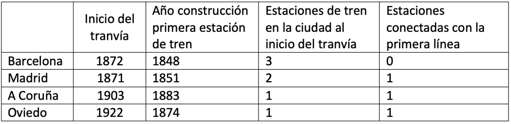 Las cuatro ciudades analizadas ya disponían de estaciones de ferrocarril el año de inauguración del tranvía, aunque eran utilizadas como nodos de conexión con otras regiones del país. Estas estaciones estaban ubicadas a las afueras de la ciudad, por lo que el tranvía surgió como una solución al transporte urbano.