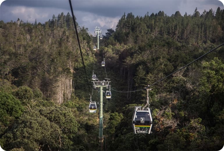 Cabinas de Metrocable atravesando una zona boscosa a las afueras de Medellín.