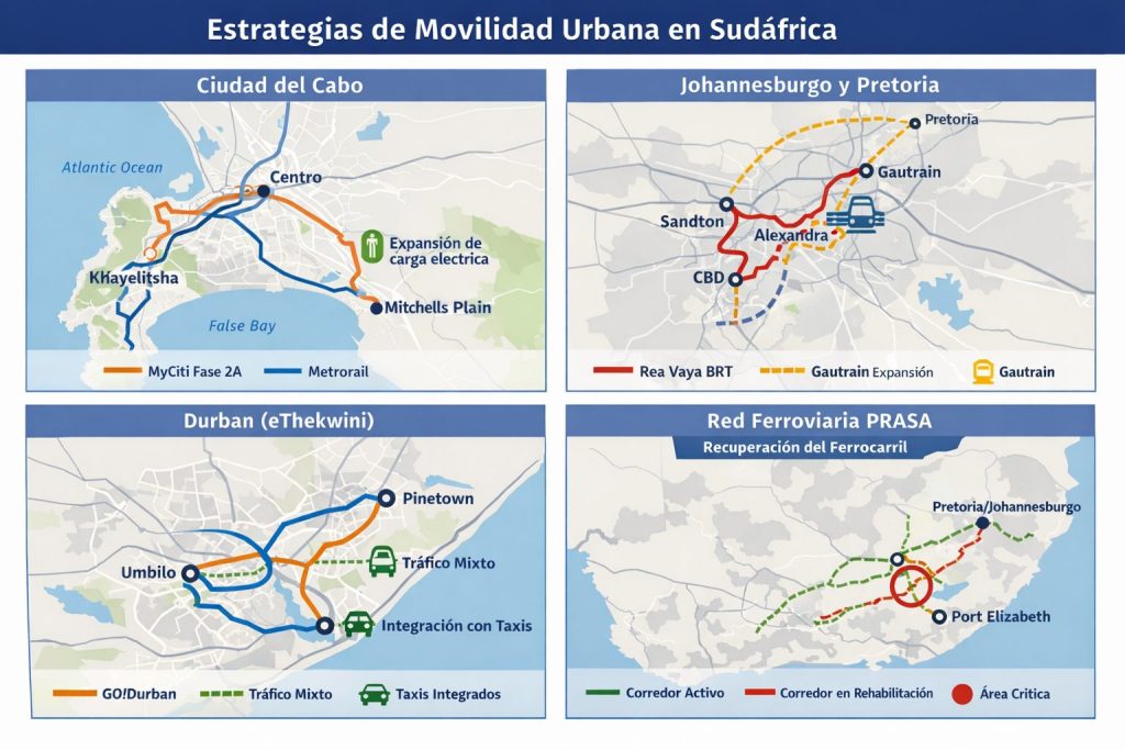 La movilidad urbana sudafricana se encuentra en un punto de inflexión: si las ciudades consolidan la modernización ferroviaria, culminan sus BRT con prioridad operacional, y consiguen integrar al sector minibús con pagos digitales y estándares de servicio, el país puede capturar beneficios económicos (productividad, empleo), sociales (accesibilidad, seguridad) y climáticos (menores emisiones). El riesgo es una década más de fragmentación e infraestructuras subutilizadas. La oportunidad: alinear movilidad, energía y política industrial (EVs) para que las áreas metropolitanas impulsen el crecimiento inclusivo.