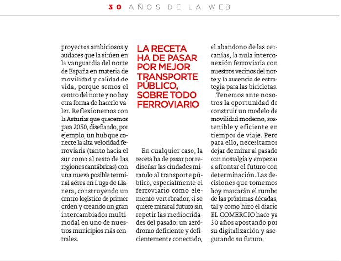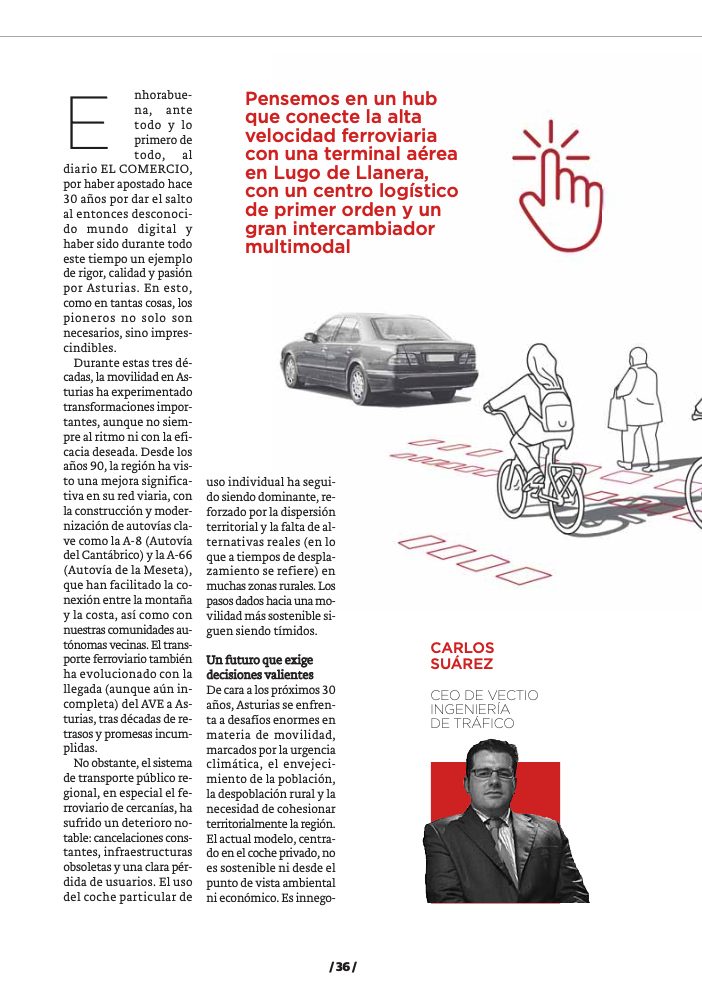 Con motivo del 30 aniversario de la edición digital del diario El Comercio, Carlos Suárez, CEO de Vectio, ha participado en el suplemento especial editado a tal efecto. Para el mismo se ha contado con especialistas en diferentes disciplinas y se les solicitó su visión para dentro de otros treinta años, dentro de la rama de la cual es experto. Suárez, como responsable de una compañía referente en el ámbito de la ingeniería de transportes a nivel nacional, centró su artículo en las inversiones en transporte necesarias para mejorar la movilidad asturiana. A continuación, compartimos la publicación de Carlos Suárez en el especial «Mirando al Futuro»: