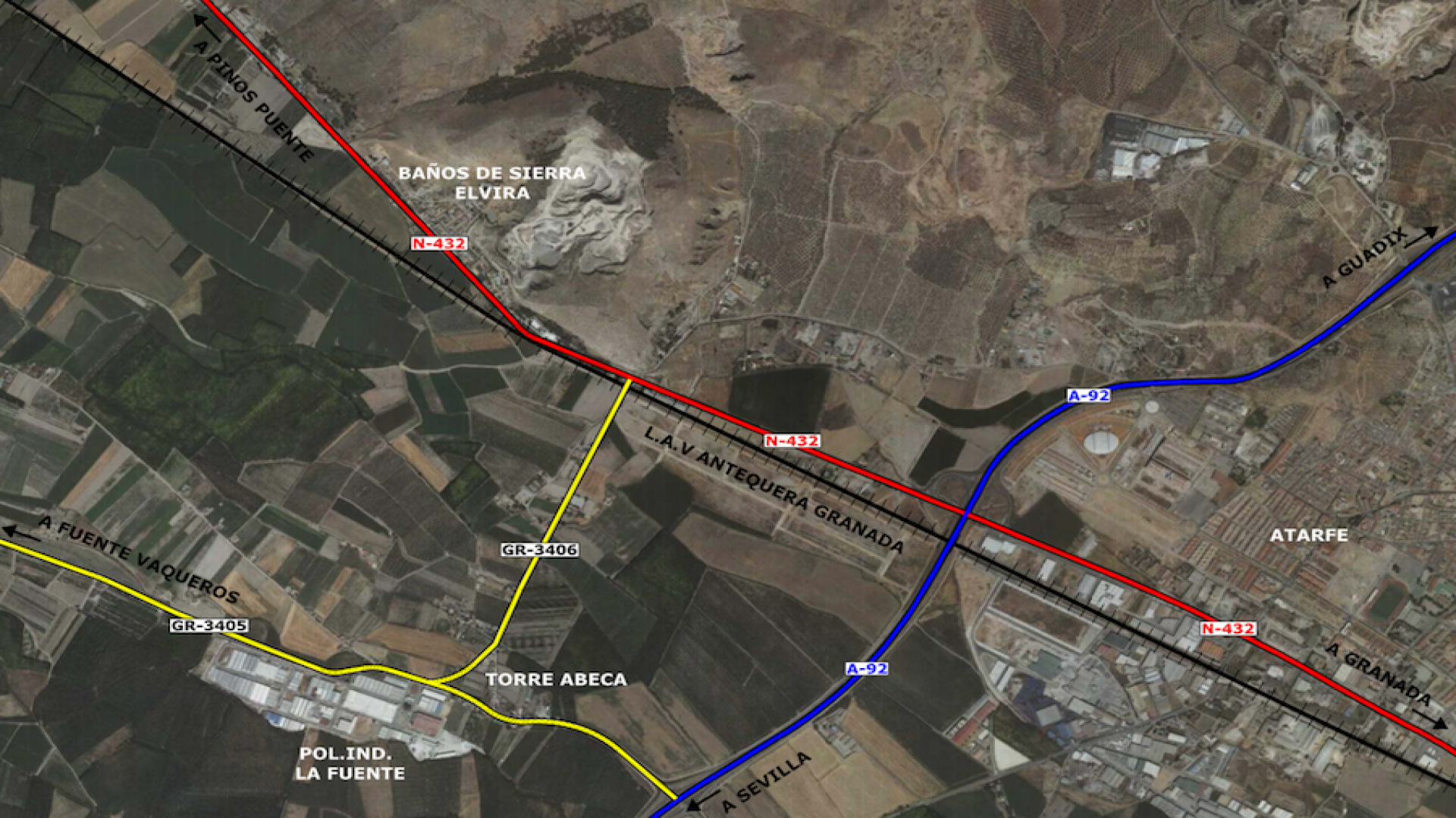 El objetivo de este estudio era el paso a nivel existente en la carretera GR-3406. Para poder suprimir dicho paso a nivel, la U.T.E. proponía una modificación del cruce existente entre las carreteras N-424 y la GR-3406 trasladando el cruce del P.K. 425+650 al P.K. 424+450.